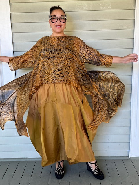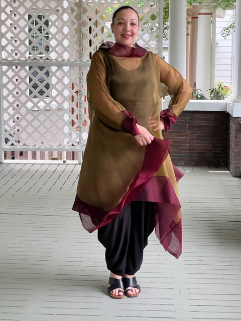 DTH 100% Silk Organza Long Tie-Back Top - Bronze/Maroon