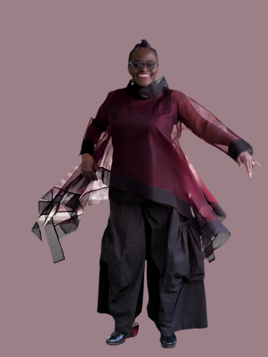 DTH 100% Silk Organza Short Waterfall Top - Maroon & Black