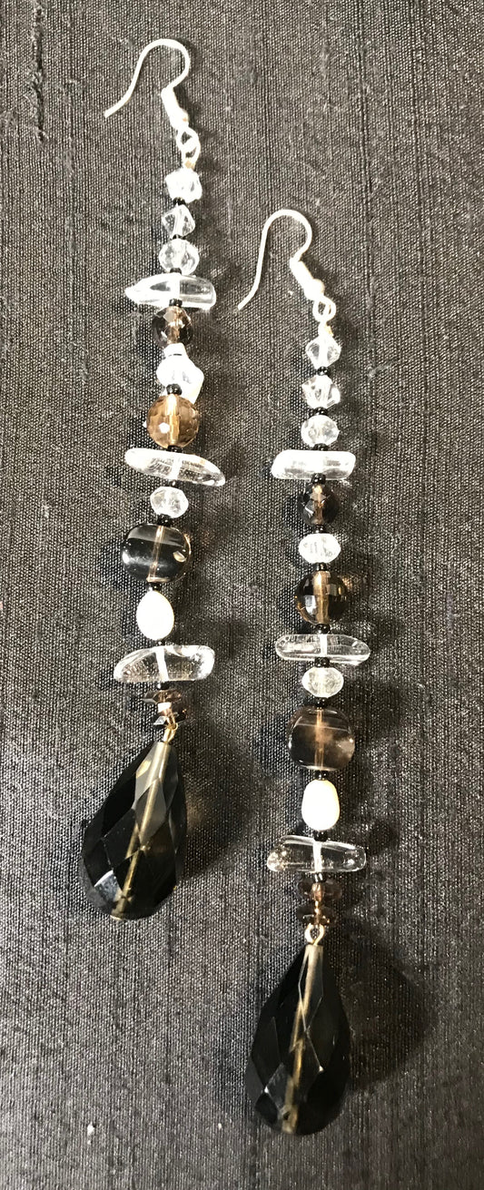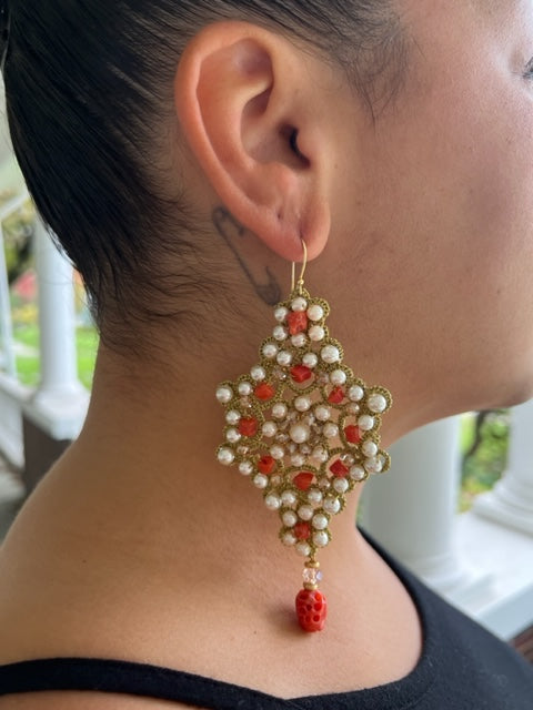 Hand Crocheted Pearl, Coral, and Crystal Earrings
