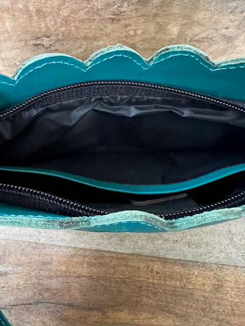 Leather Hand Tooled WristletBag In Peacock Green