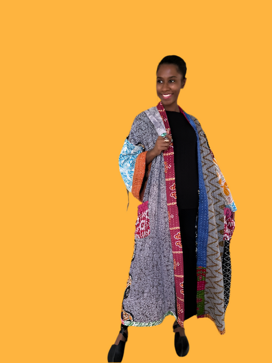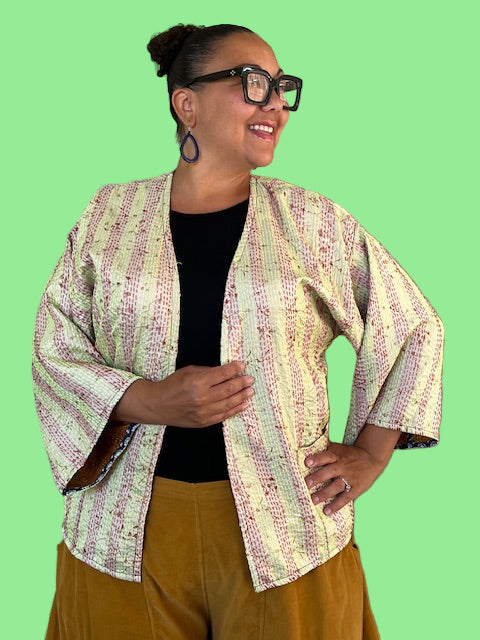 Reversible Silk Kantha Kimono Jacket (Gold/Blue/Green or Gold/Green/Red)