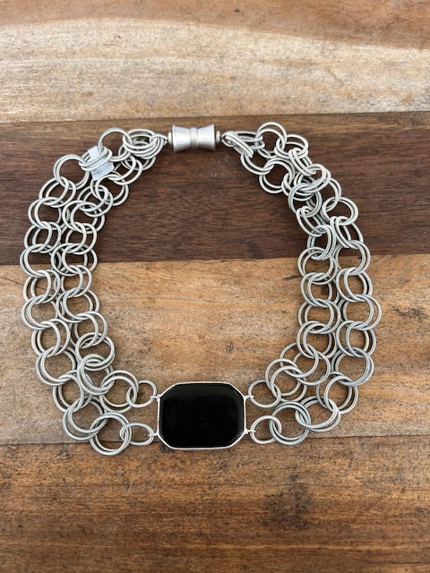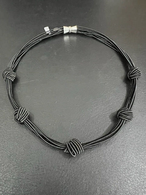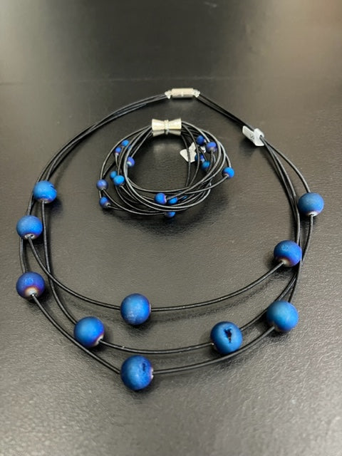 Black 3-Strand Piano Wire Necklace with Layered Blue Geodes