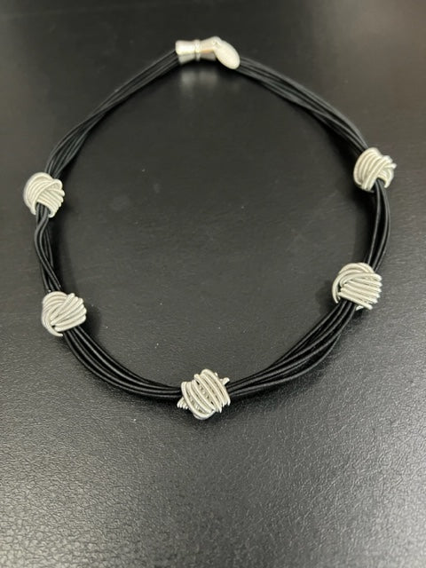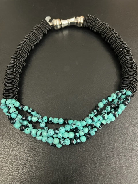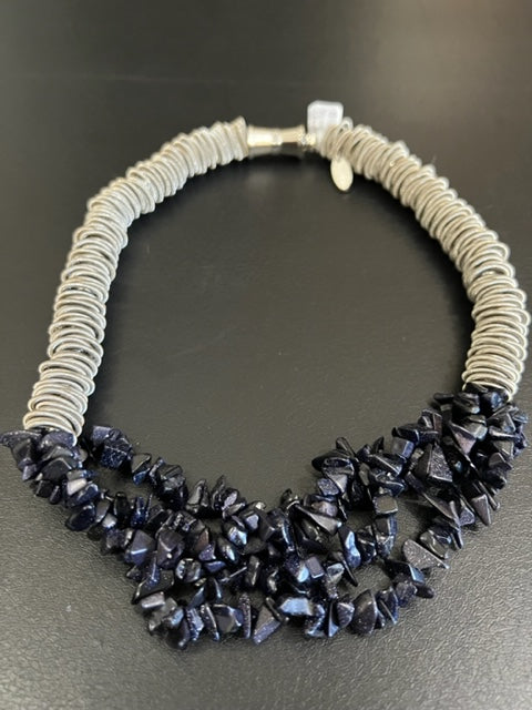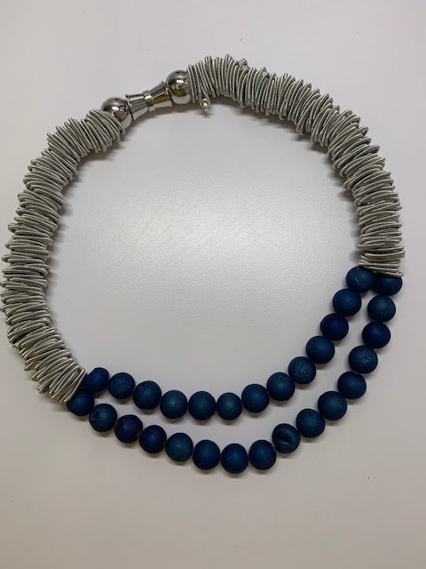 Silver Piano Wire Rings Necklace with Blue Geo Beads,