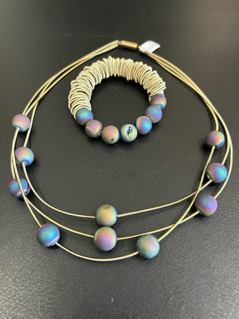 Bronze 3-Strand Piano Wire Necklace with Layered Iridescent Geodes