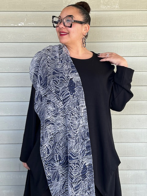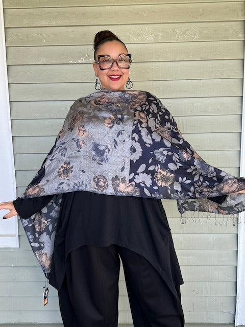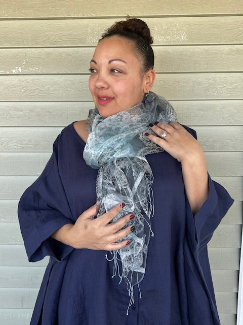 Blue Flowers Scarf (cotton ,silk blend with beaded fringe)