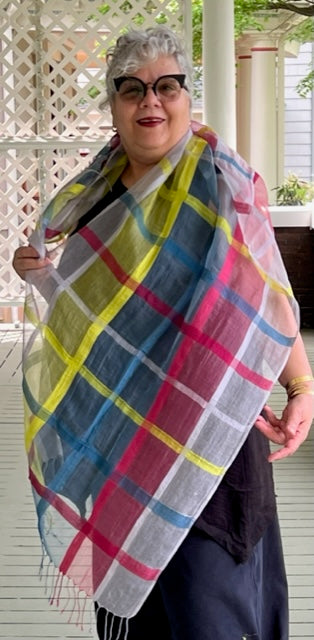 Hand Woven Box Design Scarf (Ecru, Blue, Light Grey)