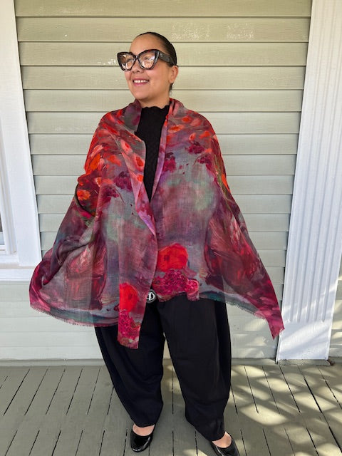 Magenta 100% Silk Dupioni Scarf Trimmed in Feathers