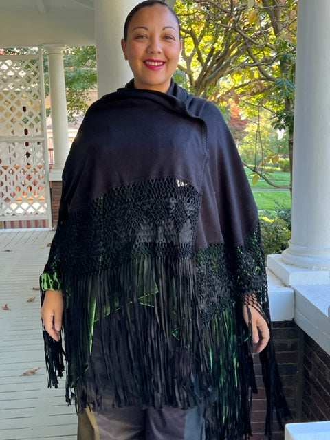 Black Silk and Cashmere Shawl with hand made macrame border