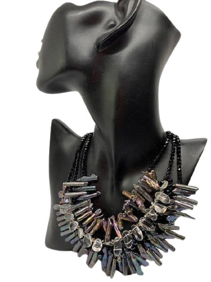 This exquisite necklace has five stands: two strands of onyx crystals; one stand of clear crystals; one stand of copper iridescent stick pearls; and one strand of gray iridescent stick pearls.