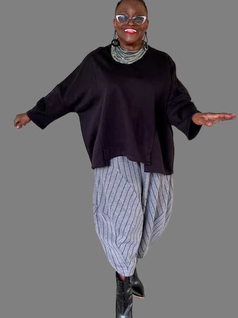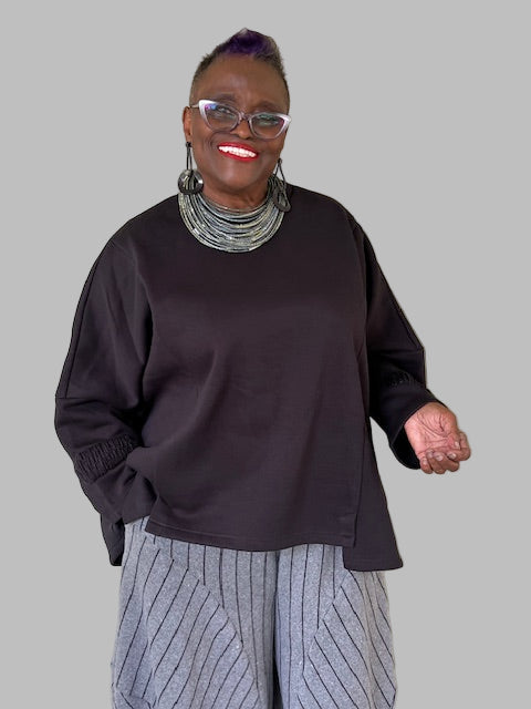 This black top in a rich ponte knit has a shirred detail on each sleeve (Shown here with Amma Astral Pants)