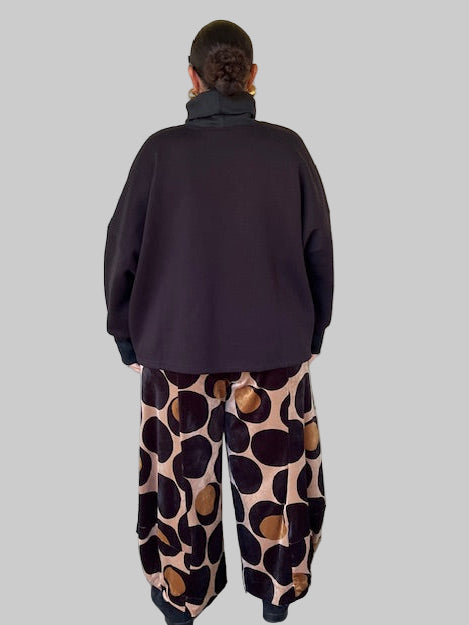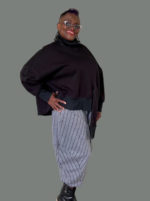 This black top in a rich ponte knit has a cuffed sleeves and hemline with a cutout (Shown here with Alembika Eclipse Punto Pants)