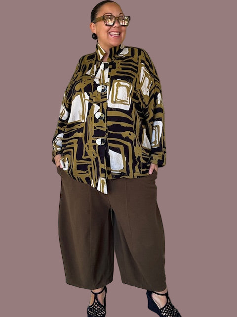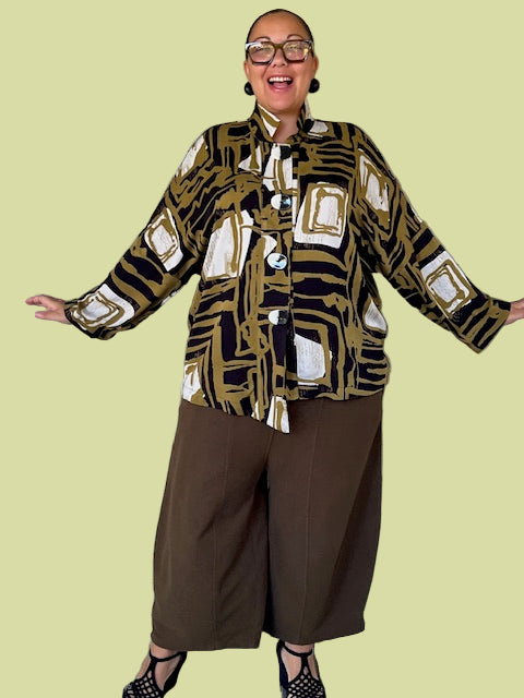 This button up top features a bold, hand-painted-inspired geometric print in rich tones of rust, black, and ivory. The asymmetrical hemline adds fluidity and movement, while the lightweight fabric make it a perfect choice for layering or standing out on its own. The matching extra large buttons make this a statement piece bringing modern art to your wardrobe Pair it with sleek black trousers or leggings for a contemporary, gallery-ready look. Shown here with gerties hobo pants in African gold .