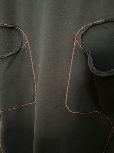 This cotton/spandex bubble dress has red stitched salvaged seams and two front pockets.