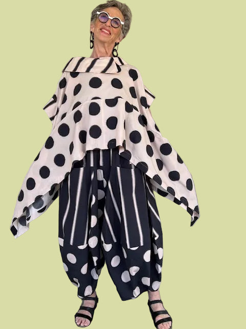 This 100% cotton top has a wide, split cowl neck with sides that are longer than the front and back. There are two pockets in the sides.(Shown with Kedem Sasson Juno Pants)