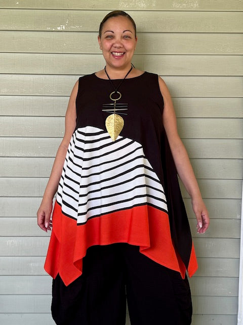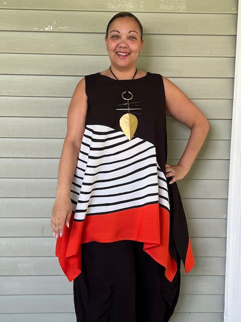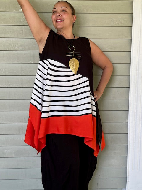 This top has a beautiful black and white wave design with a red border to highlight. The 100% rayon makes it a perfect summer weight top.
