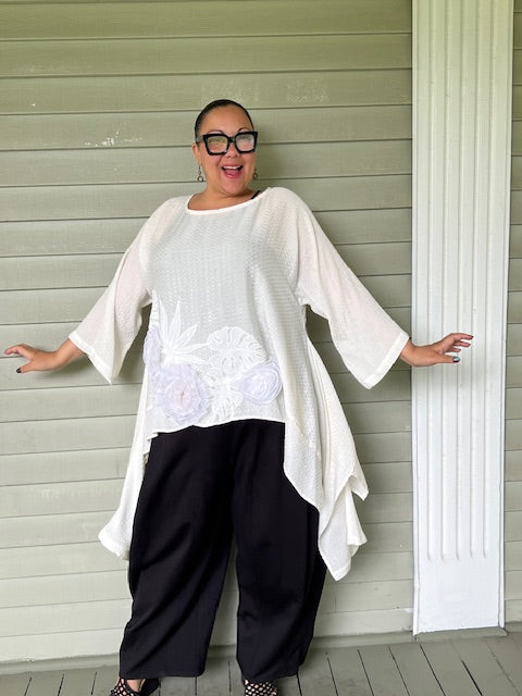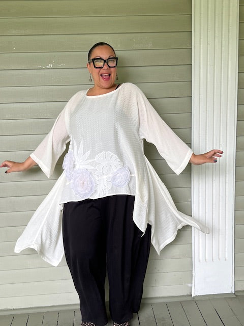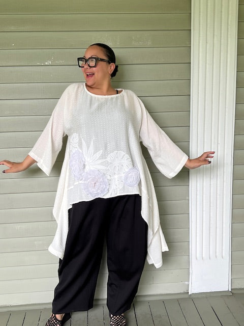 This beautiful top has beautiful flowers appliqued on the front. There are two different layouts. but very similar The top has so much flair to it you'll want to dance to see it move. Wear it over a dress or pants, it works both ways. (Shown here with DTH Architect Skirt in 100% Silk (Black) and White Button Hem Pants)
