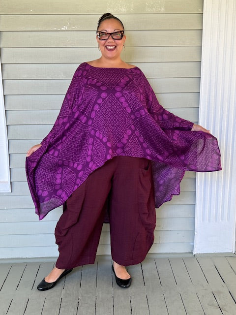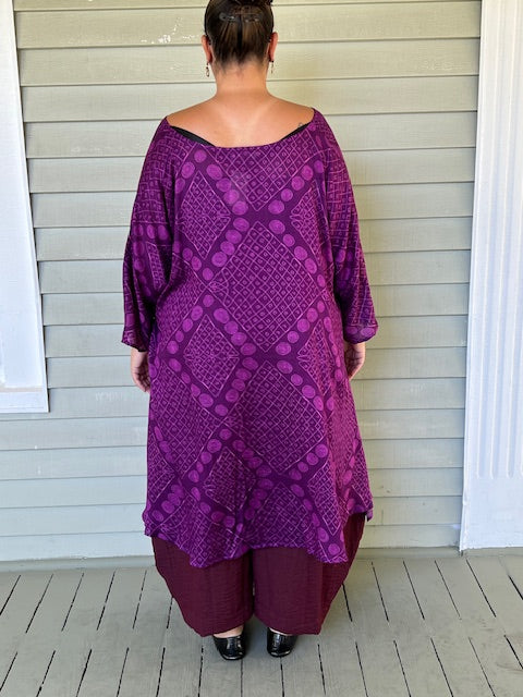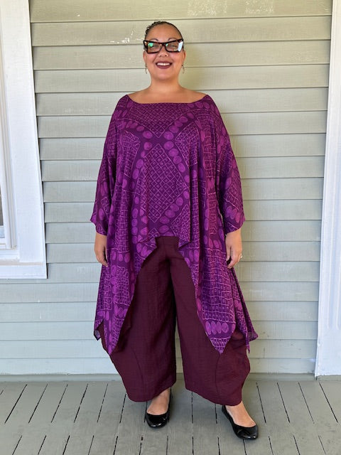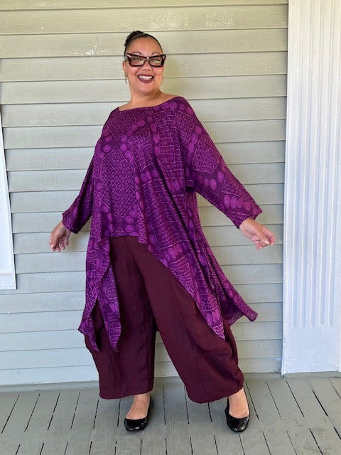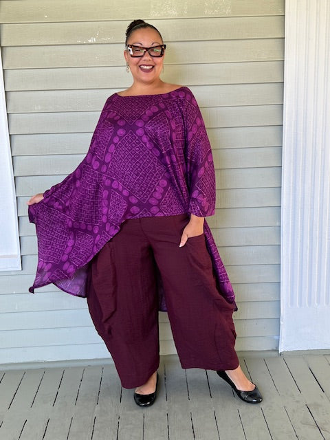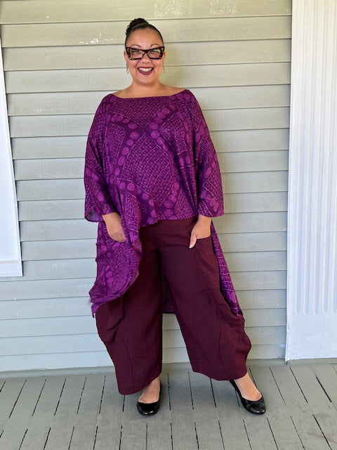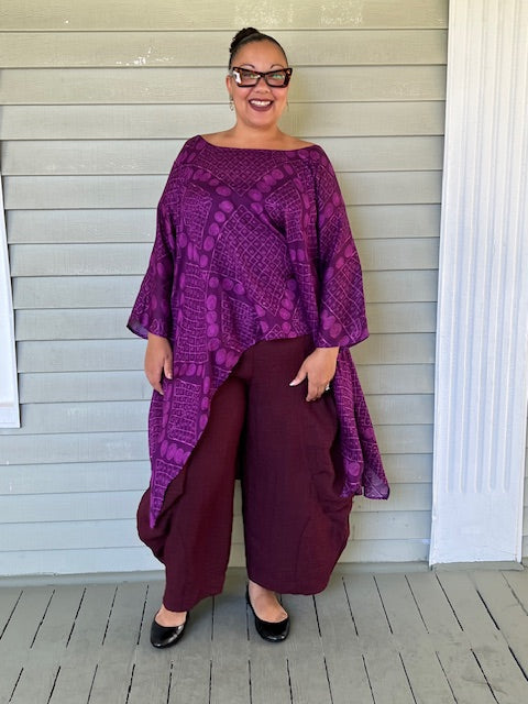 This top is made in fabric which has been beautifully hand painted in Mali and sewn into our signature hi lo fit. It is perfect for any event where you want to stand out.