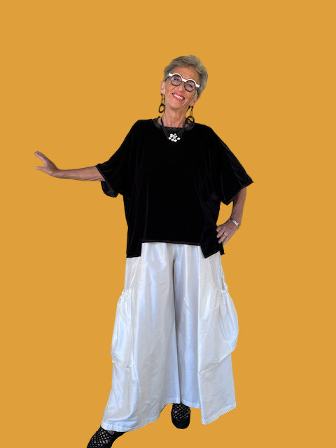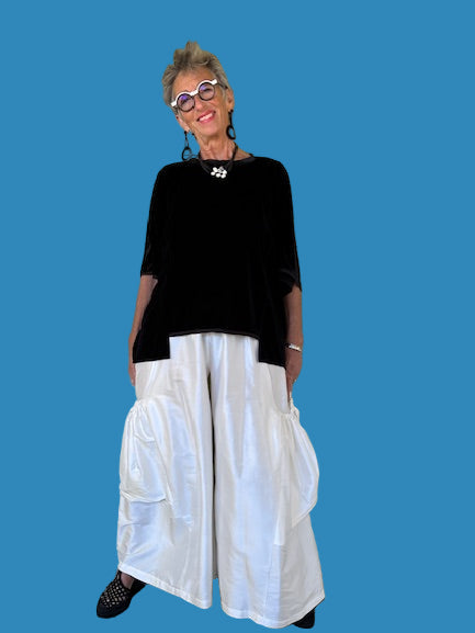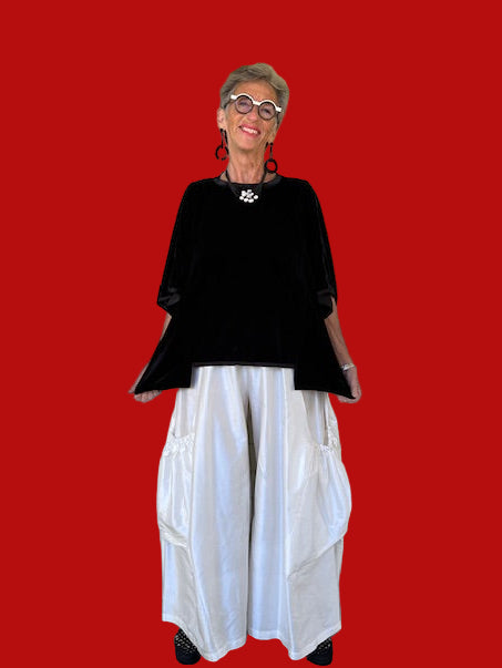 This velvet top is shorter in the front and longer in the back and is trimmed in stretch silk charmeuse. The velvet is so soft and luxurious that you'll want to wear it often.one size fits all . (Shown here with DTH Velvet Stretch Pants)