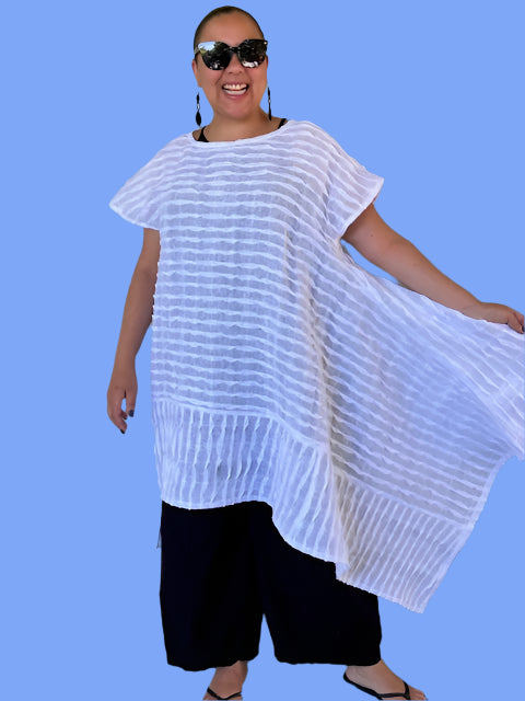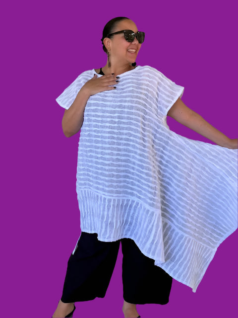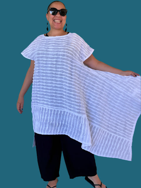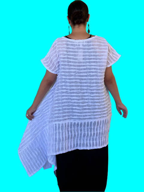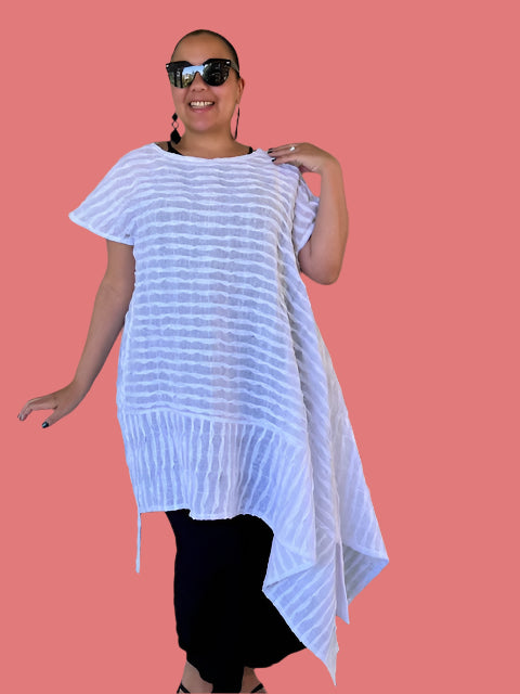 This elegant DTH white mixed fabric top with its horizontal pleats and and asymmetrical hemline is perfect for that special event.