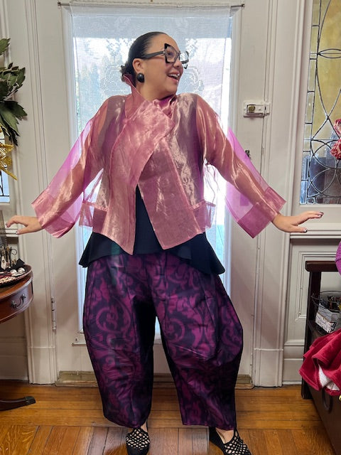 This sheer, cropped jacket is made from 100% Shimmering silk organza. It has a large collar and is open in the front. You can wear this versatile jacket with a gown or jeans - up to you! It is a one size garment. (Shown here with DTH Seamed Pants in Ikat Silk Design)