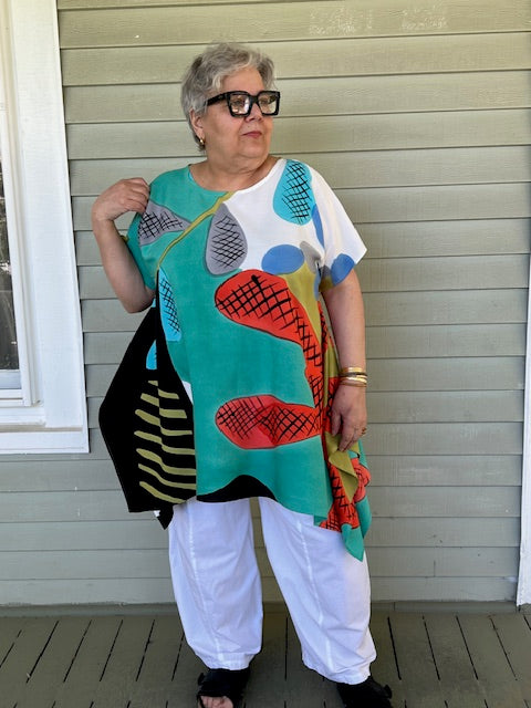 This top flows beautifully and will look great over biker shorts, long slacks, a black dress or skirt - style it your way .There is a slit on the sleeve and the print is amazing. Put a T-shirt under it for a new look. 100% rayon, perfect for all your summer days and nights .