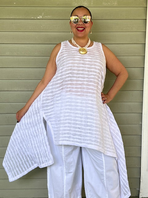 This elegant DTH sleeveless, white linen top with its horizontal pleats has a slit on one side, revealing vertical pleats. The perfect top to make an entrance with.
