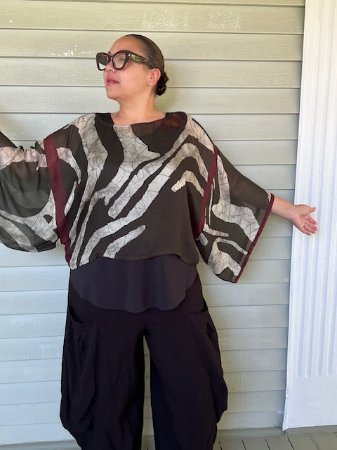 This light-as-a-feather tissue top in model fabric with a zebra print will dress up any pants or skirt - and can even be worn over a dress because it's so lightweight