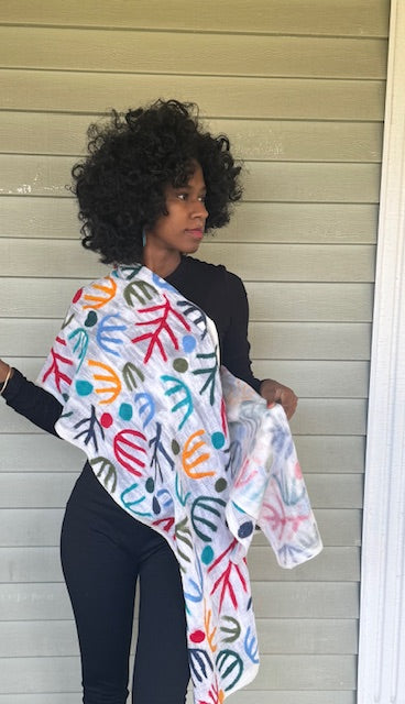 Inspired by Henri Matisse cut out work this scarf has a beautiful multicolored cut out pattern on a white chiffon background /17by 76 in long