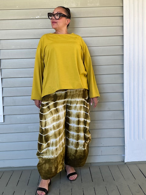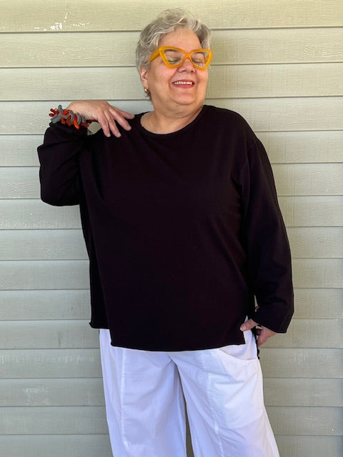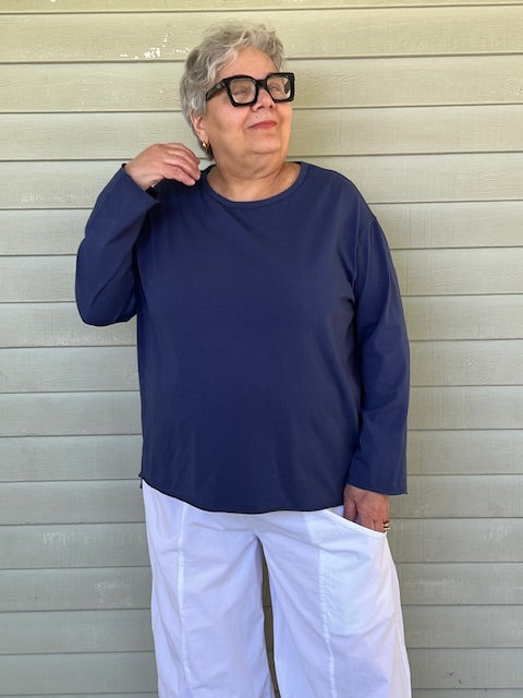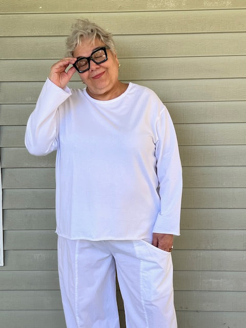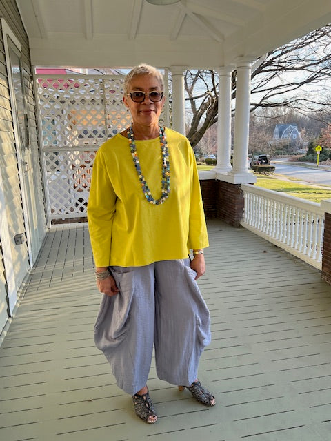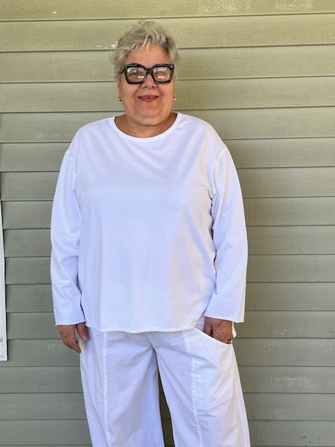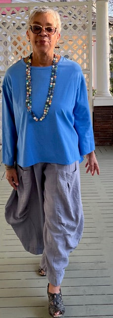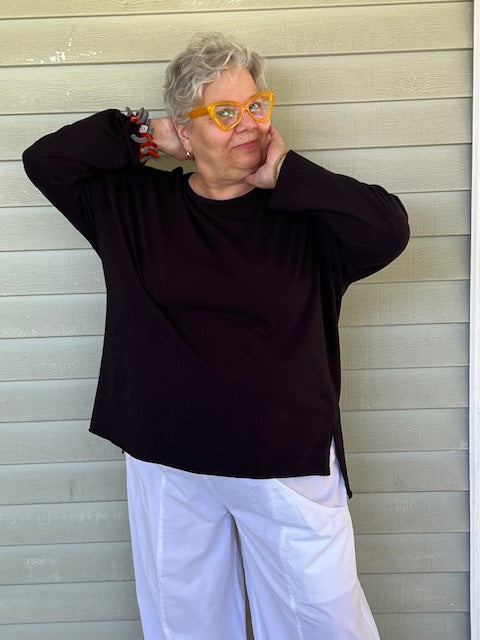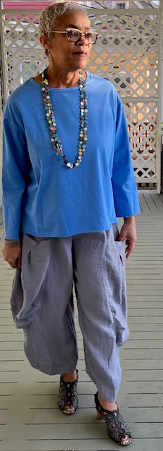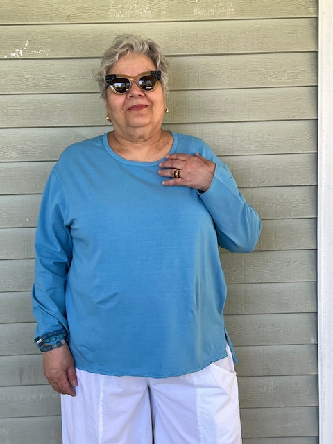 This tee from Gerties North Star collection is long, lean and extra cozy, made in 100% cotton knit .It is a perfect piece for spring and ocean breezes. It features a scoop neckline and full length sleeves with 6" slits at the sides. This tee is true to size made in USA
