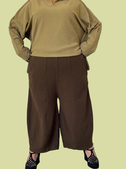 A part of Gertie's knitted canvas collection, the Hobo Pant has a comfortable stretch waistband, an extended rise, side pockets and a full leg with slimming center seams.