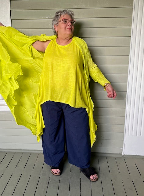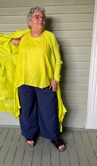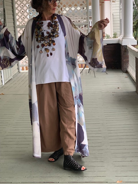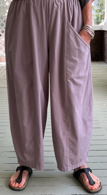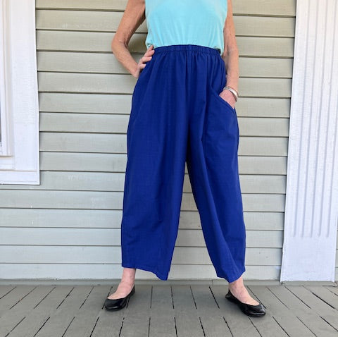 This one pocket pant has a seam down the front and back of the pants giving them a beautiful drape. Features one pocket on the front ,these pants are a summer weight fabric.( 60% tencel ,40% cotton )