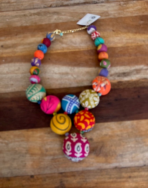 Kantha necklace crafted with upcycled fabric, the Kantha Poloma Necklace is a sustainable choice for any fashion-forward individual. Each piece is thoughtfully designed to reduce waste and promote environmental consciousness. Elevate your style while making a positive impact with this unique accessory.