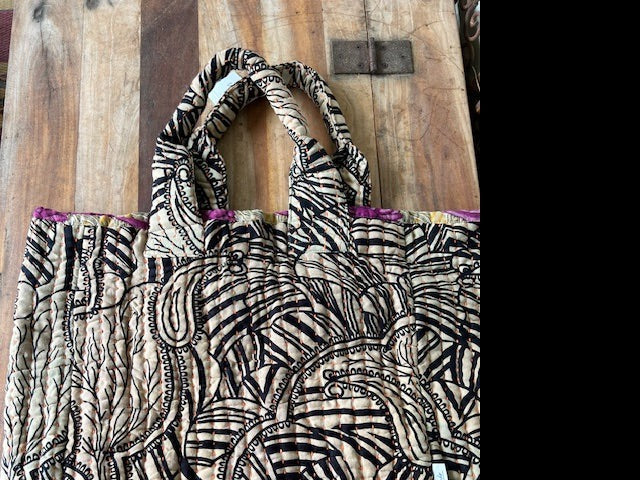100% quilted cotton fabric from factory scraps. These bags are reversible and each design is a masterpiece. Hard to choose which way to carry it. 23" x 16"x 8"Share