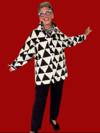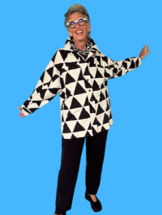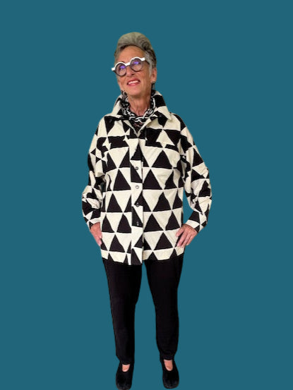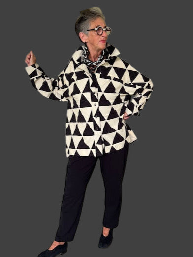 This jacket in 100% cotton features a bold black and white triangular print. The jacket buttons up the front with a collar that can stand up or lay flat.