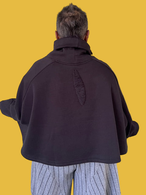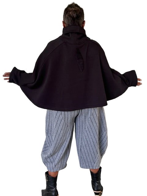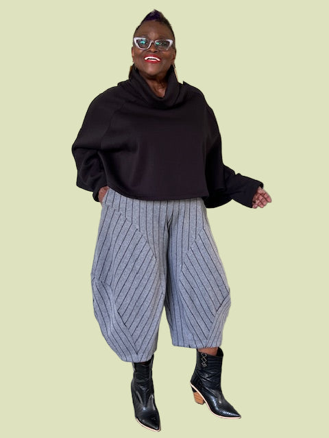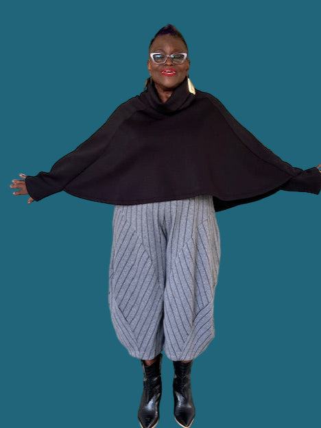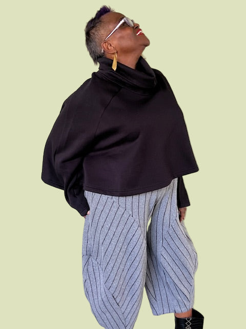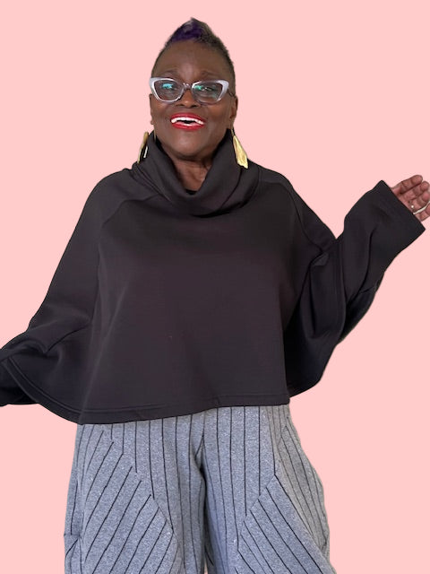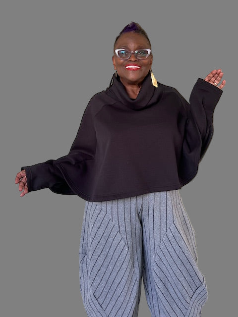 This black ponte knit shirt is slightly cropped and tight at the sleeves. One size fits most. Shown here with Amma Astral Pants)