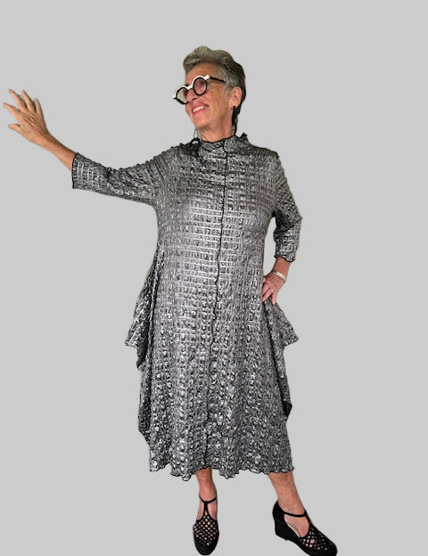 , with black zipper up back.Crafted in a rich fabric with an all-over grid texture, this standout dress features a high neckline, full-length sleeves, and a voluminous A-line silhouette that flatters every figure. The asymmetrical hemline and architectural draping add movement and drama, while the subtle black contrast peeking from the hem provides a striking finish.