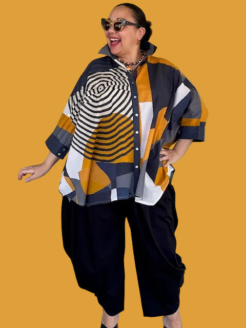 This oversized, button up shirt is made in a design of rich gold and gray. The shirt has horizontal pleats across one side of the bodice down to the sleeve cuff
