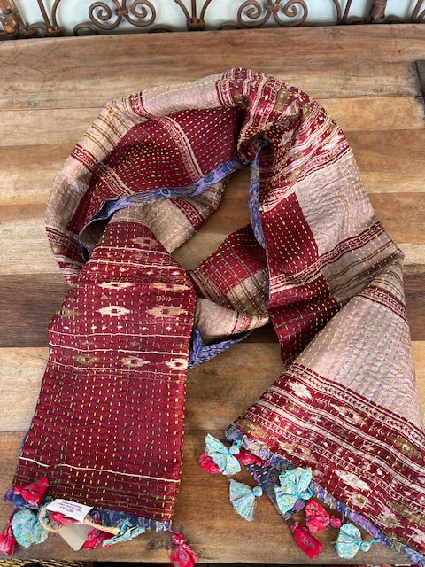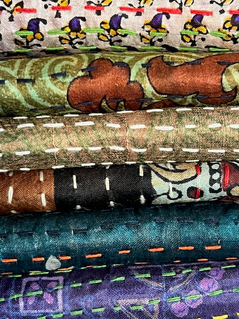 These Patch Work Silk Kantha Scarves are made from upcycled silk saris, giving them a unique and eco-friendly quality. Each scarf is one-of-a-kind, making it a stylish and sustainable addition to your wardrobe. Experience the beauty of traditional Indian craftsmanship while reducing your carbon footprint.measures 12 by 76 .they come in an assortment we will pick for you very hard for us to do as they are all beautiful