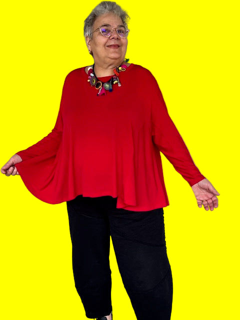 Designed with a flowing A-line silhouette, this top offers a graceful drape that flatters all body types. The soft, stretch knit fabric ensures comfort, while the minimalist design makes it a versatile piece for both casual and dressier occasions. Finished with refined detailing and a modern neckline, it’s the perfect blend of comfort and sophistication.