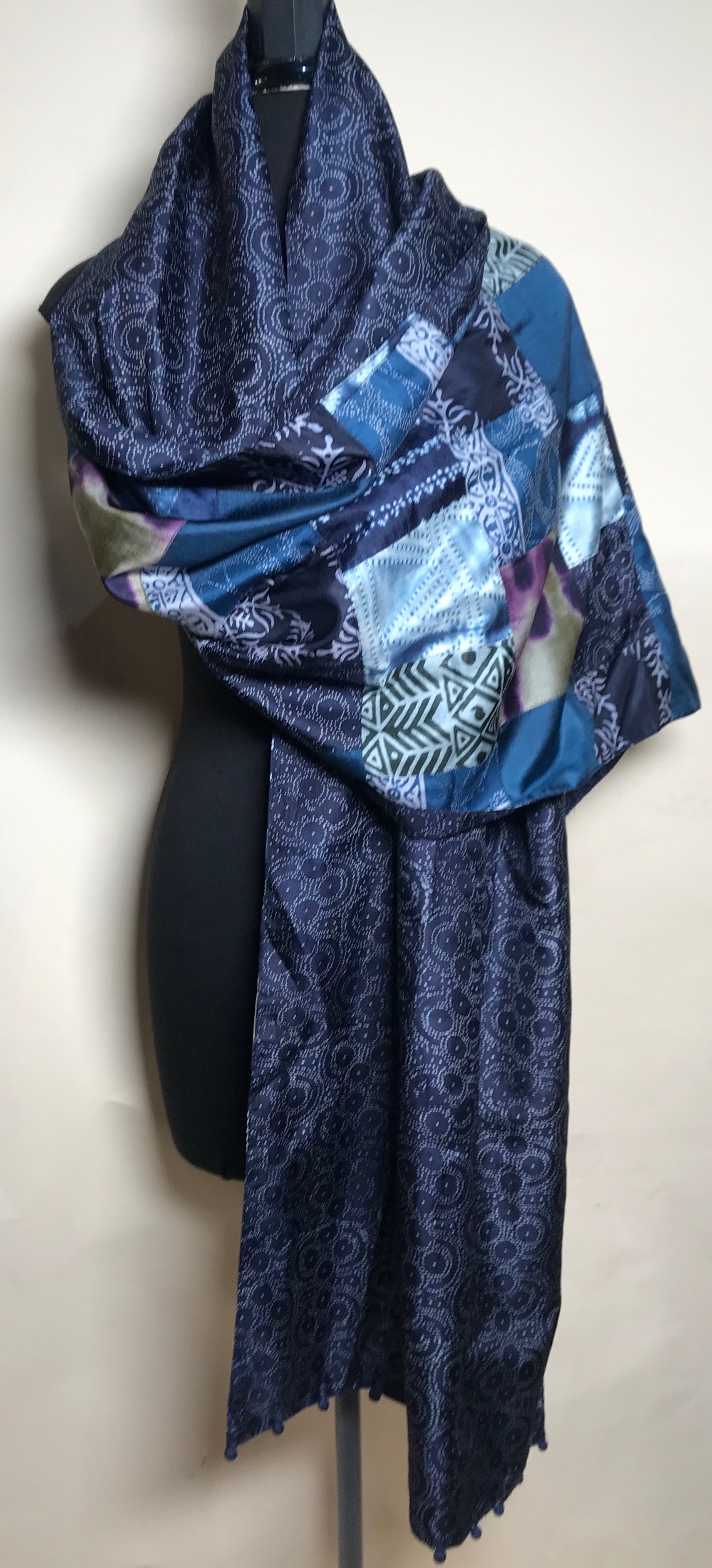 This gorgeous, handmade upcycled silk shawl in rich indigo blue is double layered with patchwork on one side & an indigo print on the opposite side. It has small silk covered balls on the hem of each end. (one-of-a-kind)