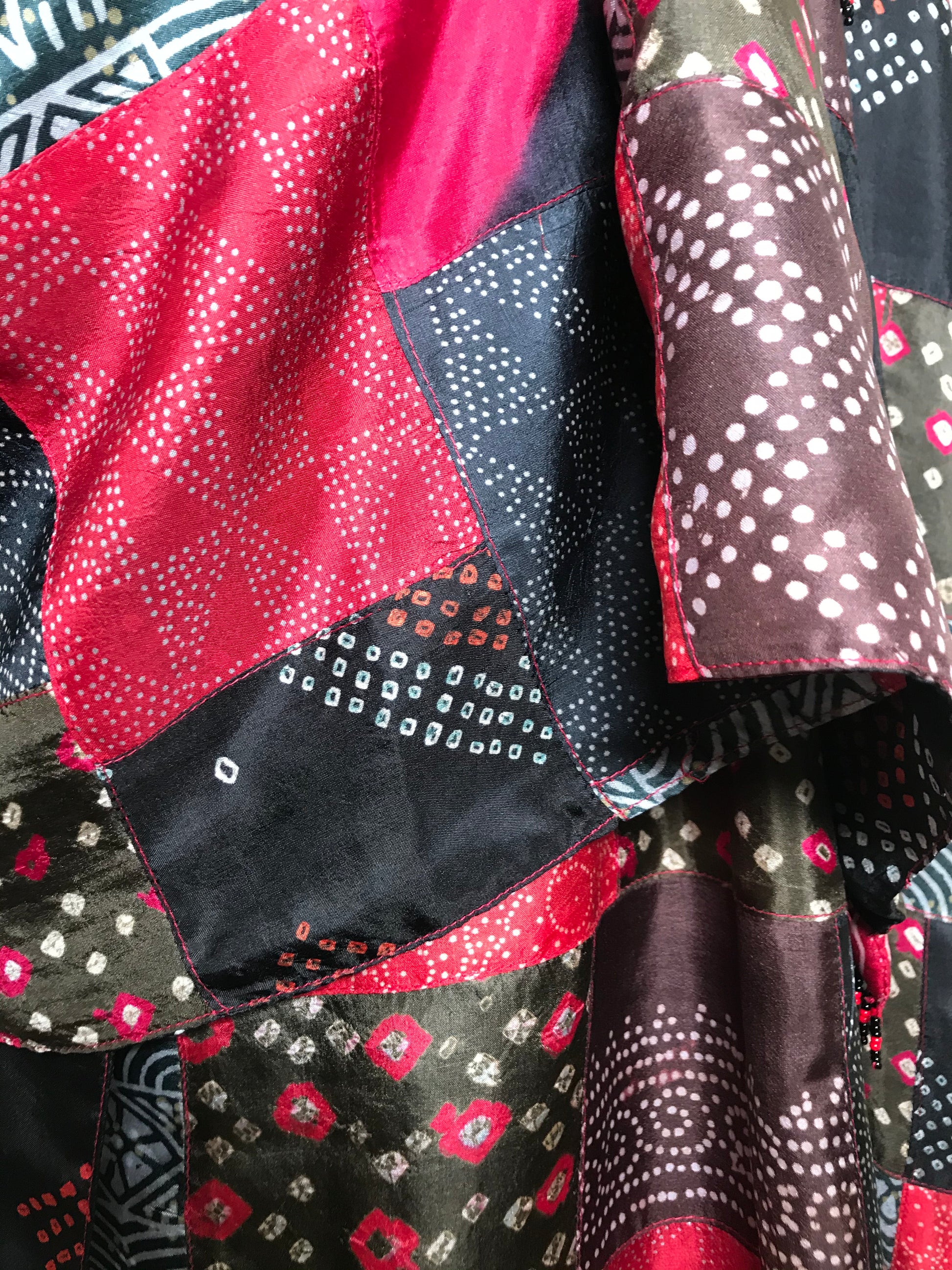 This gorgeous, handmade upcycled silk shawl is double layered with patchwork on one side & a black, red & white print on the opposite side. It has small beaded silk triangles on each of the corners which are not only decorative, but act as a light counterweight to help keep the shawl in place when it is wrapped. (one-of-a-kind)