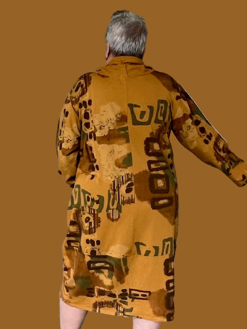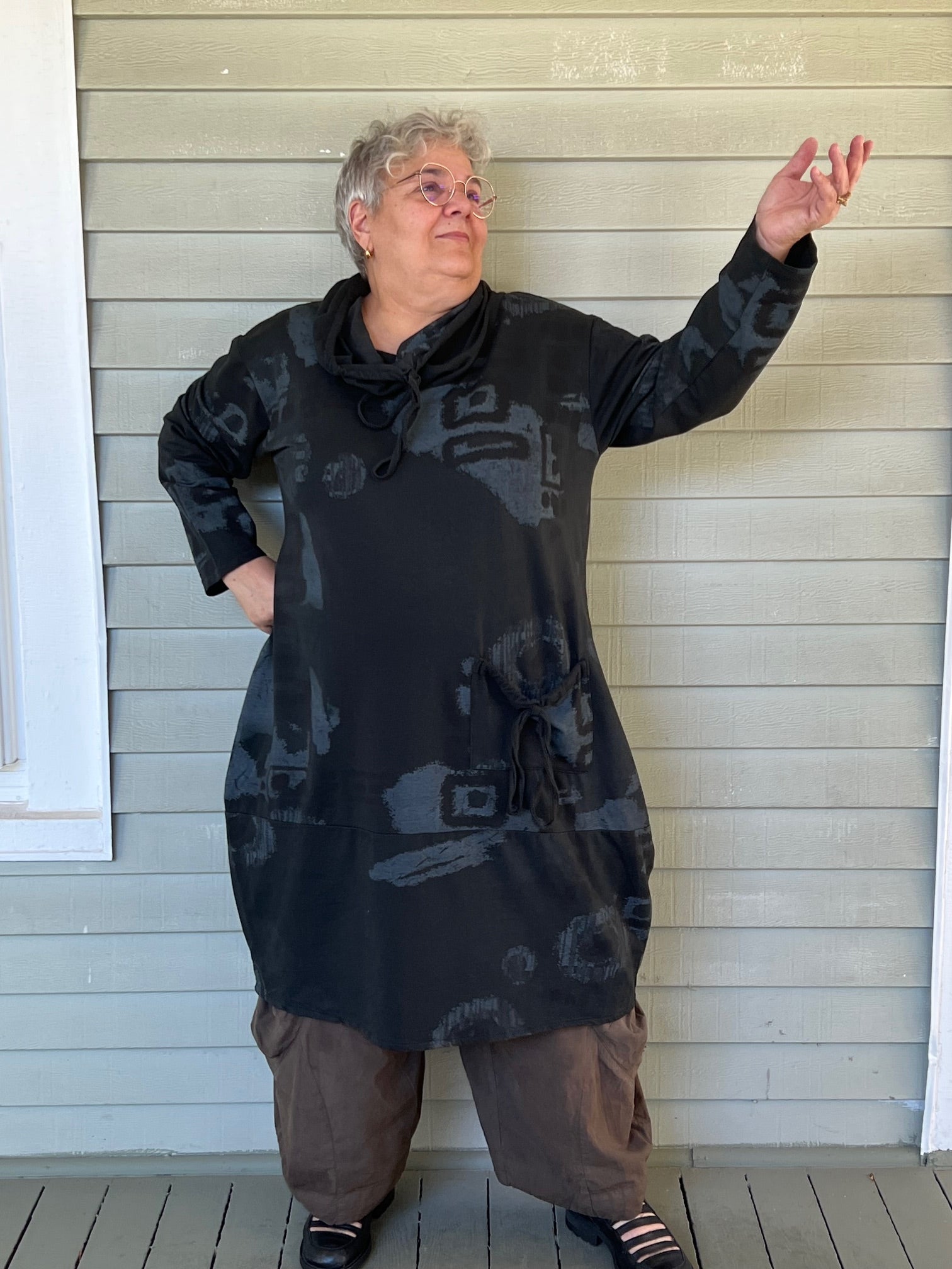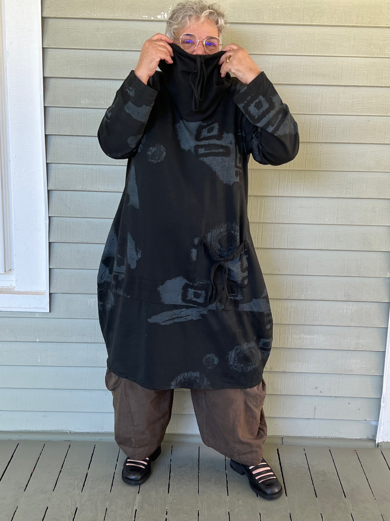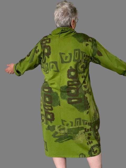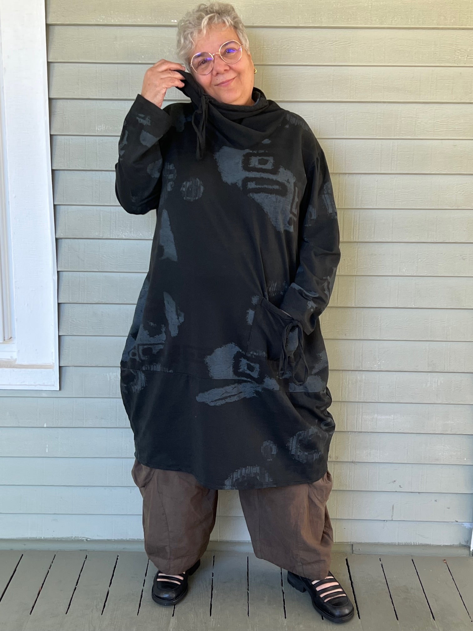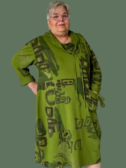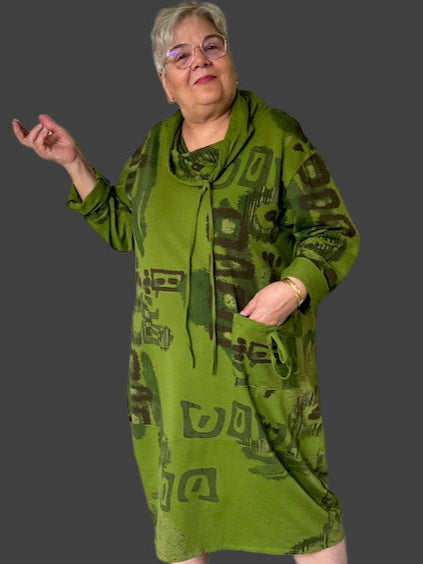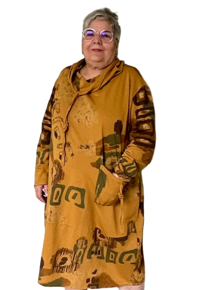 This 100% cotton dress is made in a lightweight sweatshirt material. The artful design and the drawstring cowl neck make it a hit. The front pocket make it a must!