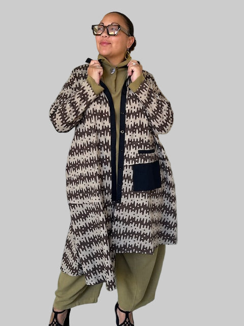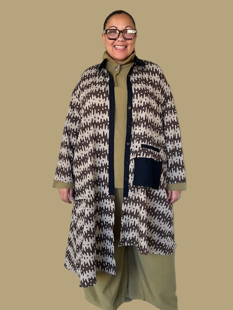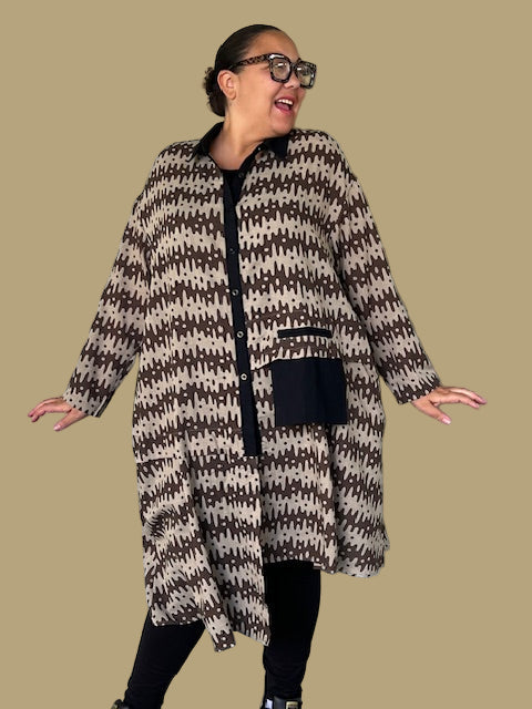 This unique shirt dress features an asymmetrical hemline, two side pockets and one front flap pocket.
